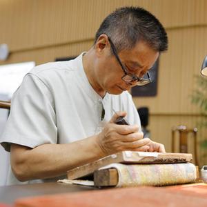 8月22日,在揚州市圖書館,江蘇省雕版工藝美術大師沈樹華在“古籍里的揚州運河文化”市集上為市民展示雕刻技藝。