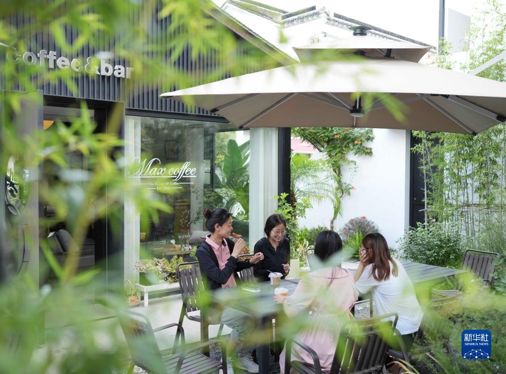 8月23日,在八里店鎮潞村,游客在一家咖啡館休憩。