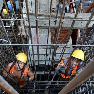 8月22日,工人在深圳城建羅湖超高層項目塔樓進行鋼筋綁扎作業。