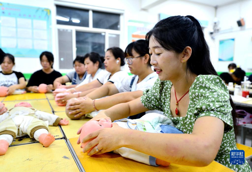8月22日,學員們在育嬰員培訓班上學習撫觸嬰兒的手法。