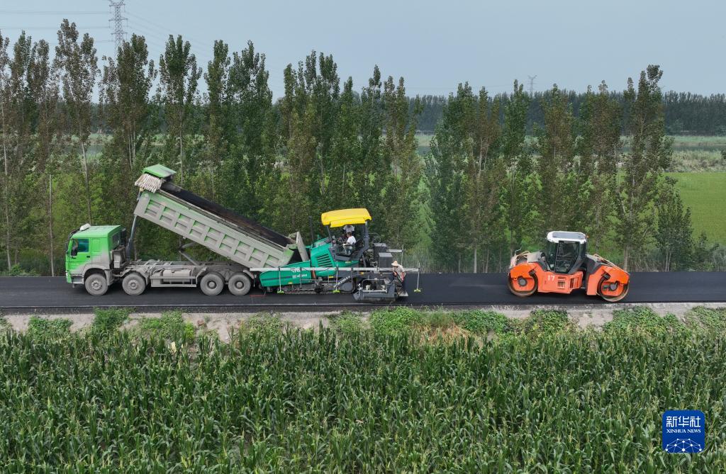 8月23日,工人在唐山市豐南區陡河沿岸鄉村公路建設工地施工(無人機照片)。