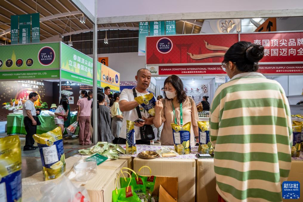 8月17日,泰國華商陳杰(右三)在南博會上銷售榴蓮干。新華社記者 胡超 攝