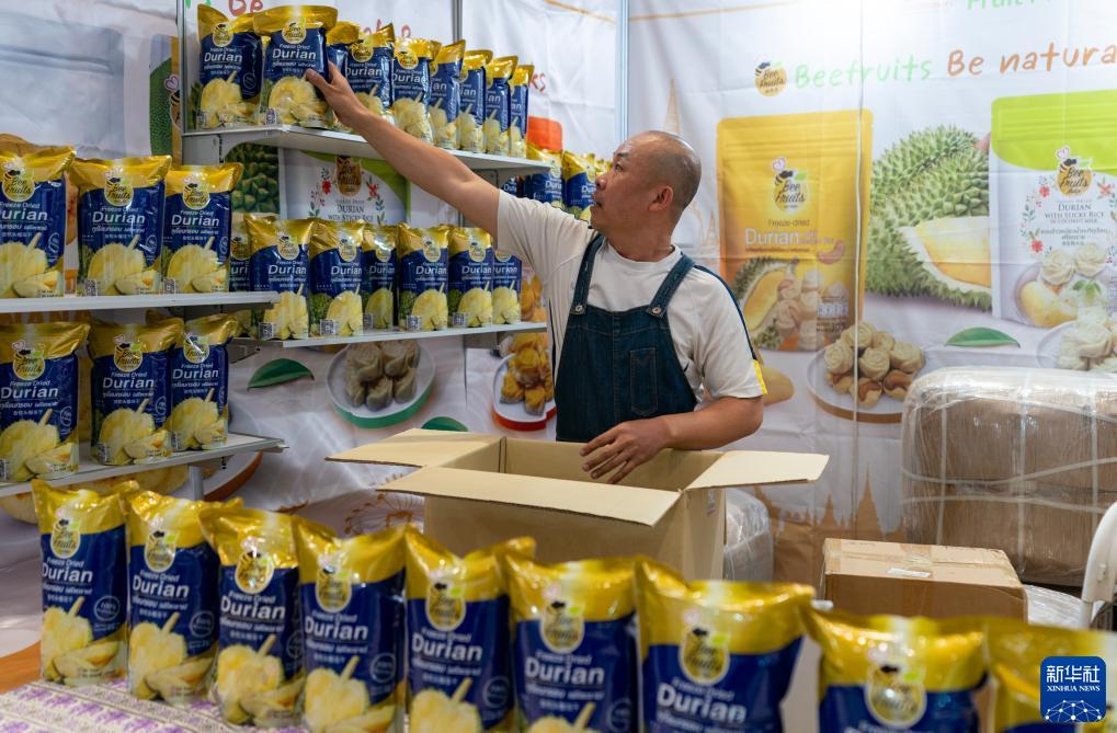 陳杰在昆明滇池國際會展中心自己的展位上擺放榴蓮干(8月14日攝)。新華社記者 陳欣波 攝