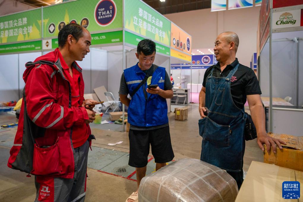 陳杰(右)在第七屆中國-南亞博覽會結束后與兩家快遞公司員工商量寄送快遞價格(8月20日攝)。新華社記者 陳欣波 攝