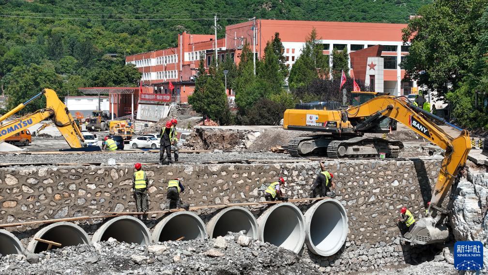 8月23日,在北京市房山區霞云嶺中心小學,北京建工機施集團的施工人員在搶建供學校與外界通行的新橋梁(無人機照片)。