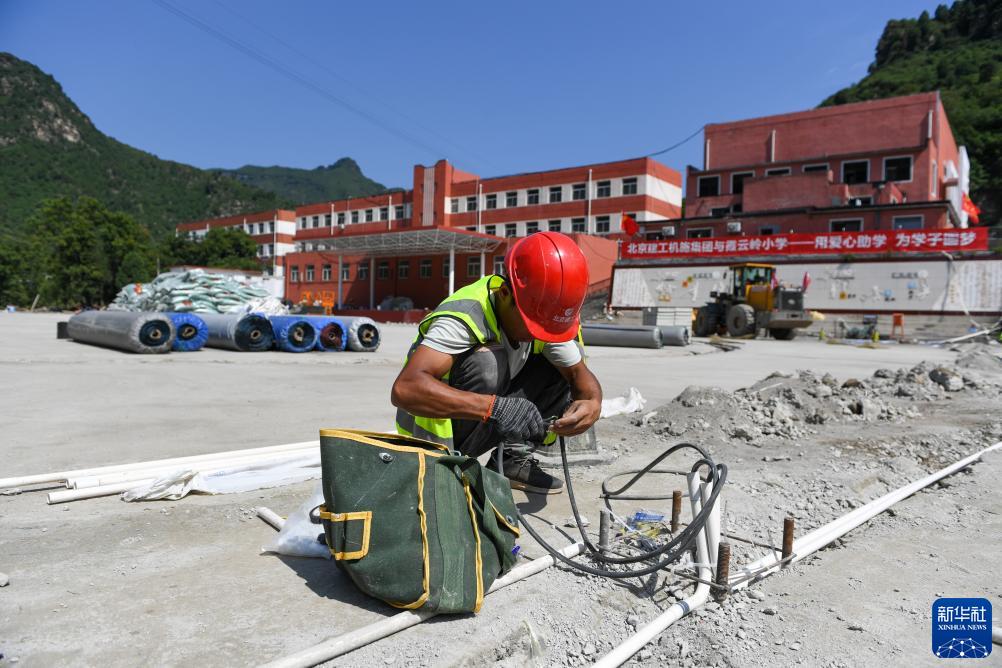 8月23日,在北京市房山區霞云嶺中心小學,北京建工機施集團的施工人員在操場上檢查鋪設的電力線路。