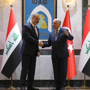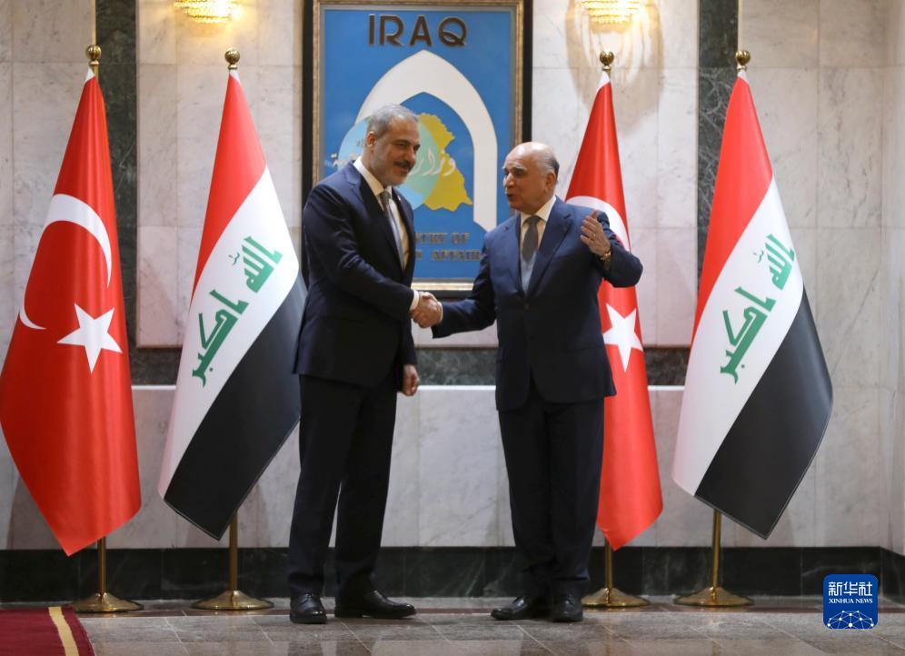 8月22日,伊拉克外長侯賽因(右)在巴格達會見到訪的土耳其外長菲丹。