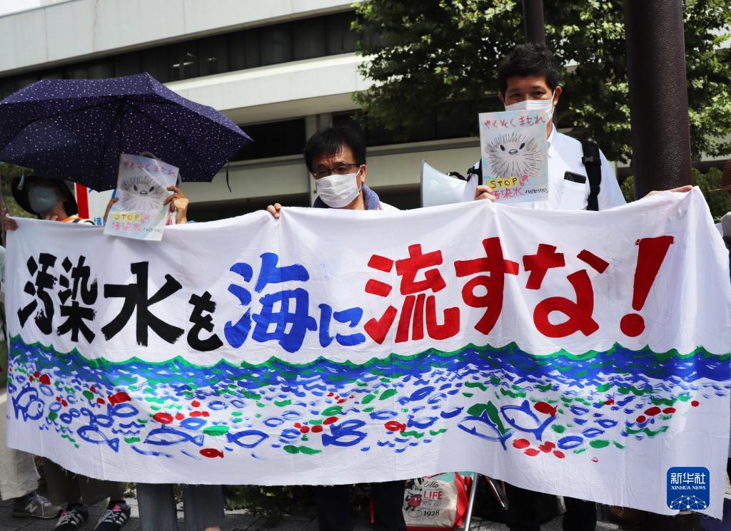8月24日,日本民眾手持“不許將污染水排入大?!钡葮苏Z在東京電力公司總部前集會,抗議日本政府和東電公司無視民意啟動核污染水排海。
