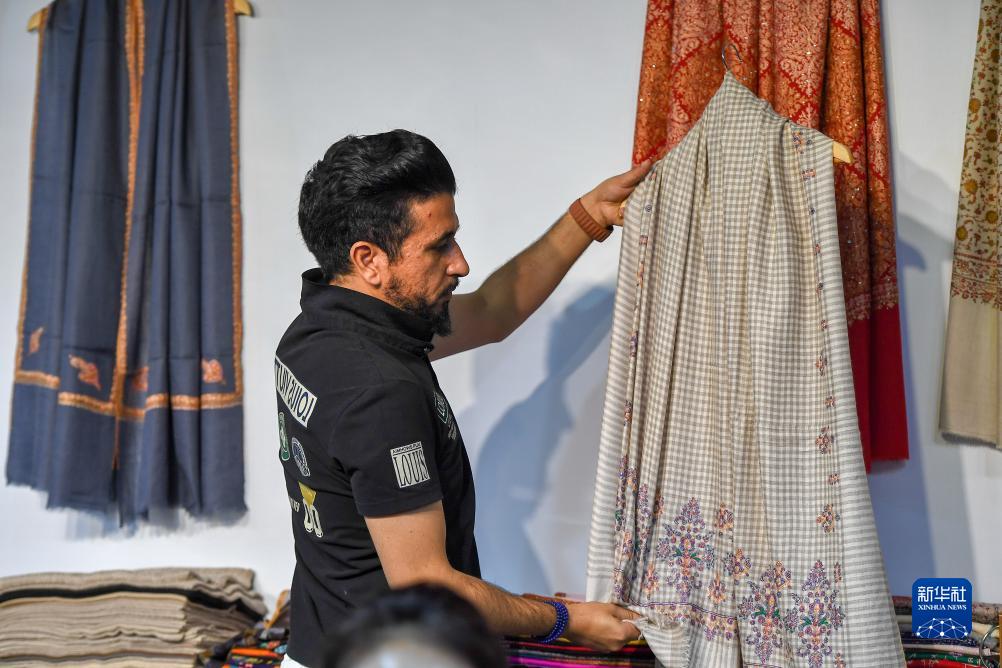 8月23日,在第十四屆中國—東北亞博覽會國際商品館,伊朗參展商懸掛紡織品。