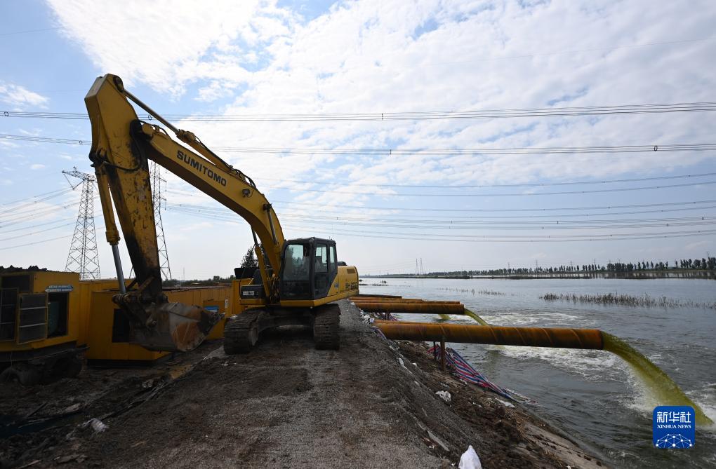 8月24日,一輛挖掘機在天津市靜海區大清河南堤抽水現場作業。