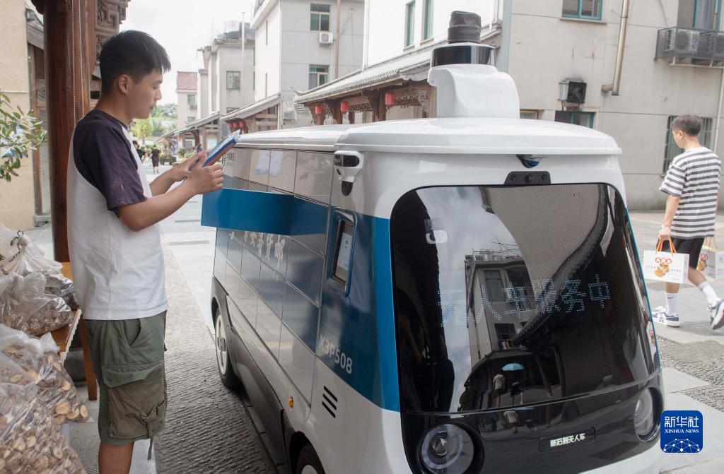 當日,浙江省磐安縣尖山鎮烏石村啟用“客貨郵”無人快遞車,長方形無人快遞車穿梭在山村街巷,派發、收取快遞件。無人快遞車由中郵驛站系統設置,村民從微信小程序上預約收貨、發貨。