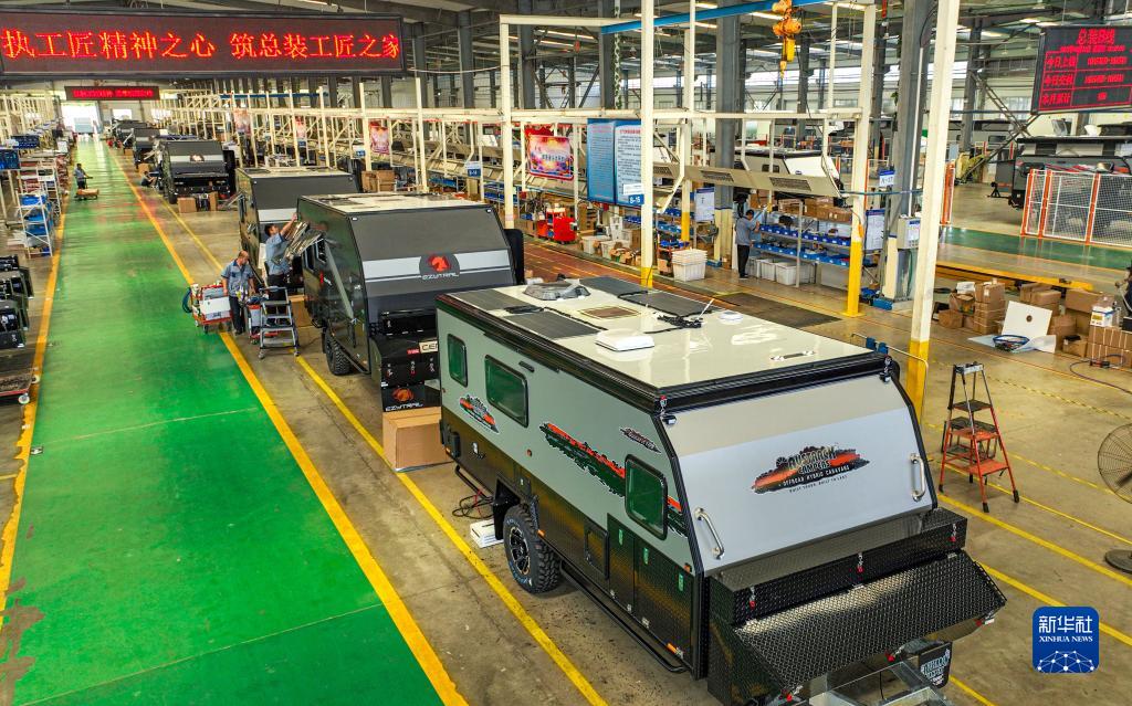 8月24日,山東省榮成市一家房車制造企業的工人在生產線上忙碌(無人機照片)。