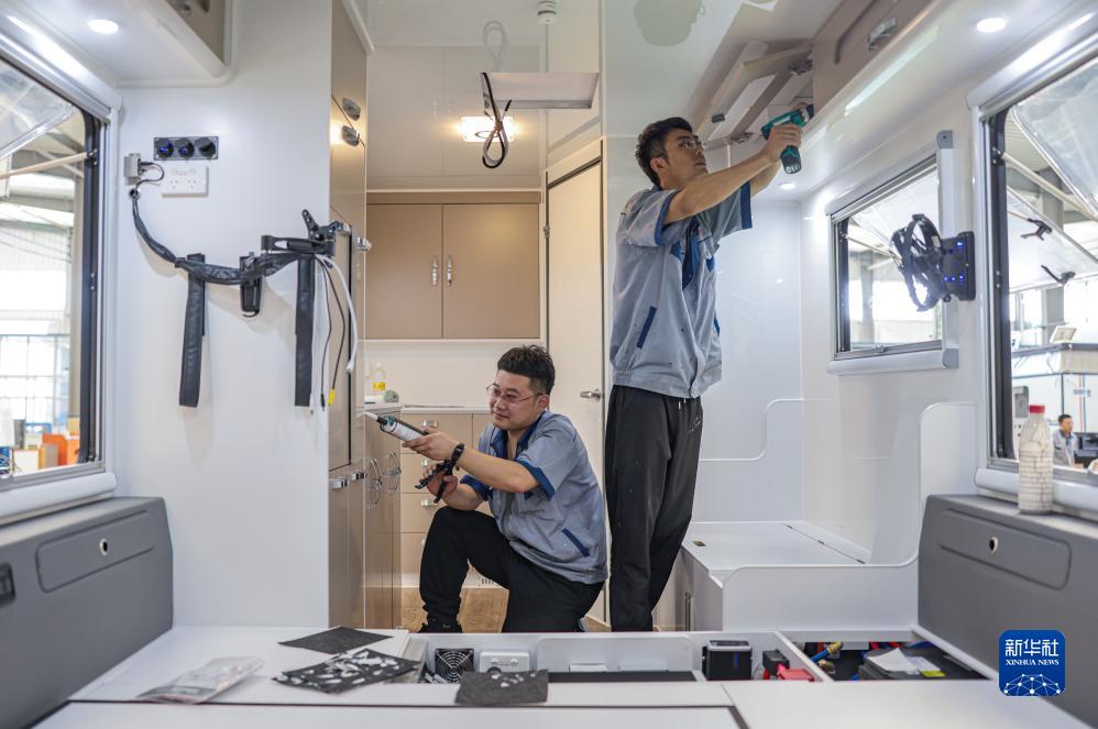 8月24日,山東省榮成市一家房車制造企業的工人在安裝房車組件。