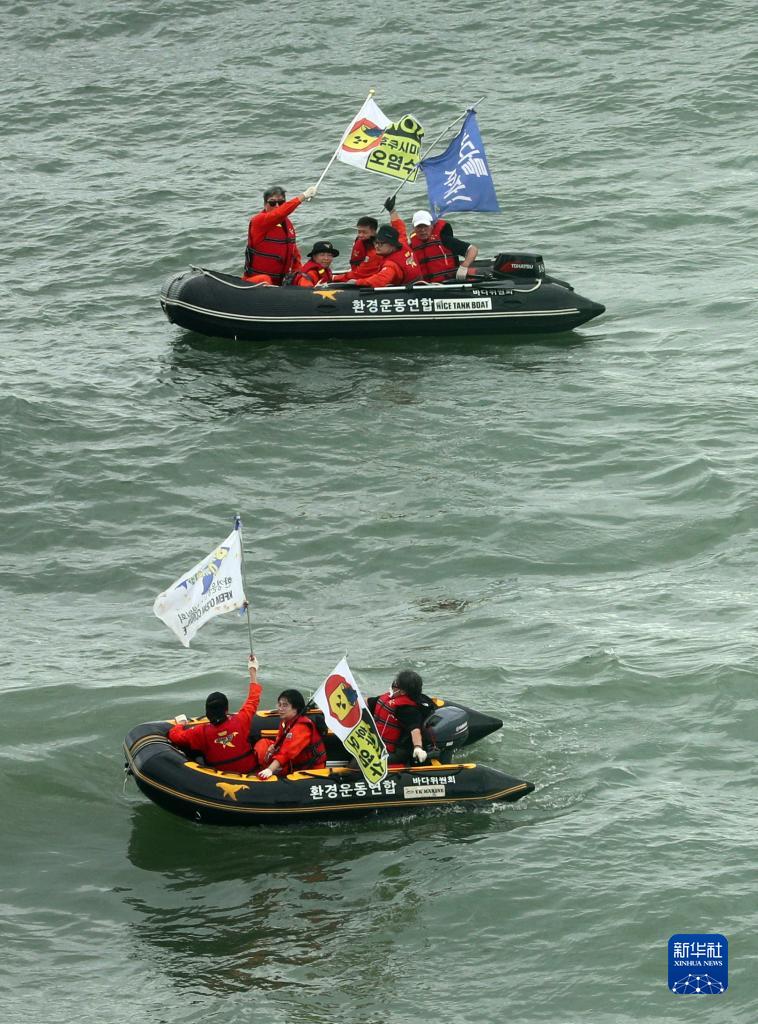 8月24日,韓國市民團體在釜山海云臺海域搭乘充氣艇,手揮標語抗議日本核污染水排海。