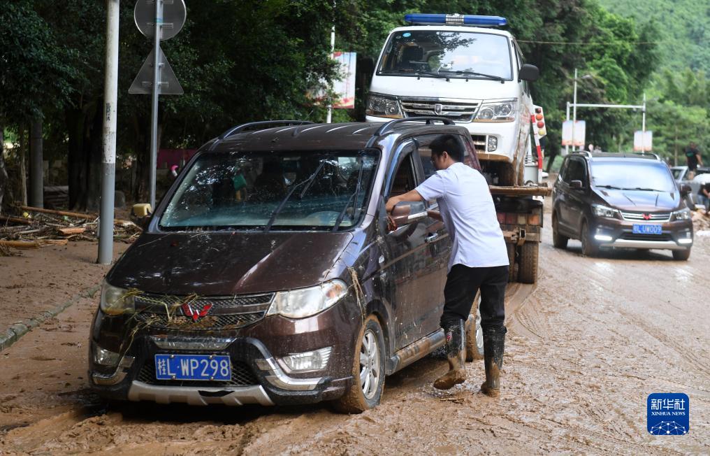 8月24日,在廣西百色市凌云縣下甲鎮,工作人員對一輛被困汽車施救。