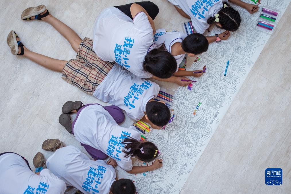8月24日,留守兒童在中國建筑科技館體驗長圖繪畫填色。新華社記者 伍志尊 攝