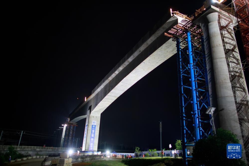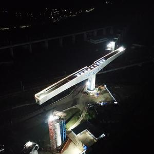 當日,由中鐵八局承建的貴南高鐵引入貴陽樞紐鐵路尖坡寨特大橋在貴州省貴安新區成功轉體。據了解,此次轉體的混凝土箱梁長約160米,重達7500噸,轉體角度約為41度,成功跨越已開通運營的滬昆高鐵既有線。