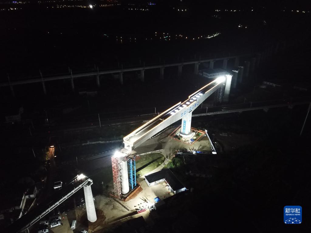 當日,由中鐵八局承建的貴南高鐵引入貴陽樞紐鐵路尖坡寨特大橋在貴州省貴安新區成功轉體。據了解,此次轉體的混凝土箱梁長約160米,重達7500噸,轉體角度約為41度,成功跨越已開通運營的滬昆高鐵既有線。