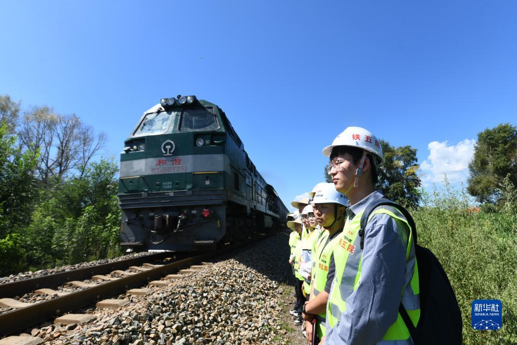 在黑龍江省雙鴨山市集賢縣的鐵路沿線,勘察班組成員在鐵路既有線避讓、等待火車通過(8月24日攝)。