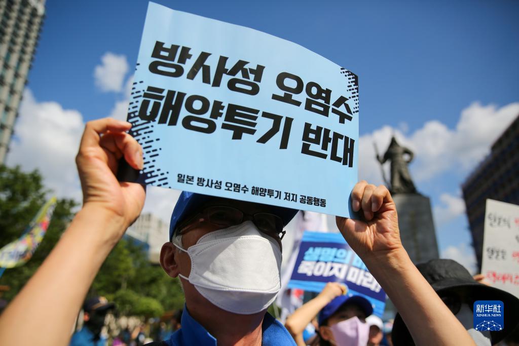 當日,韓國最大在野黨共同民主黨成員和眾多市民聚集在首爾光化門廣場,手舉標語進行示威游行,抗議日本核污染水排海。日本政府24日啟動福島核污染水排海,這一決定遭到國際社會的批評和反對。