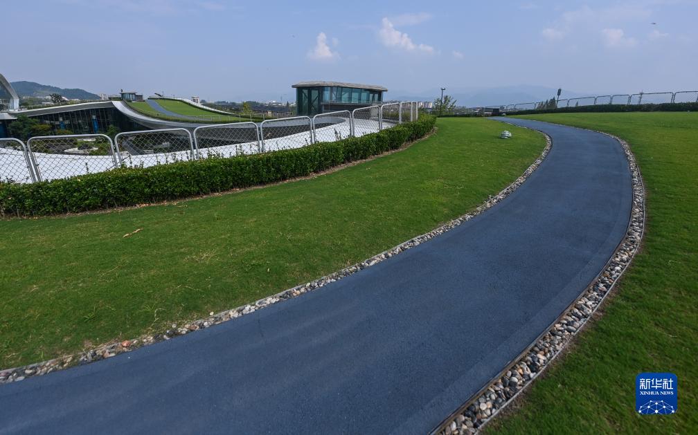 這是8月24日在杭州富陽水上運動中心拍攝的屋頂花園的草坪和步行道,雨水通過鵝卵石過濾下滲,循環利用。新華社記者 徐昱 攝