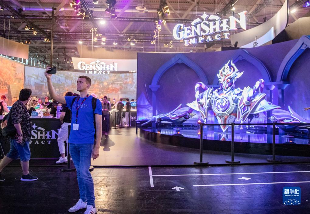 8月23日,在德國科隆游戲展上,一名參觀者在米哈游展臺前自拍。