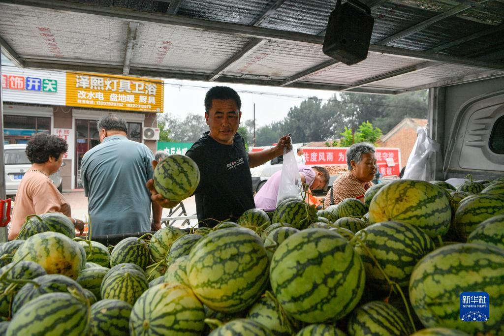 8月25日,在天津市靜海區臺頭鎮,商戶為前來趕集的村民挑選臺頭西瓜。