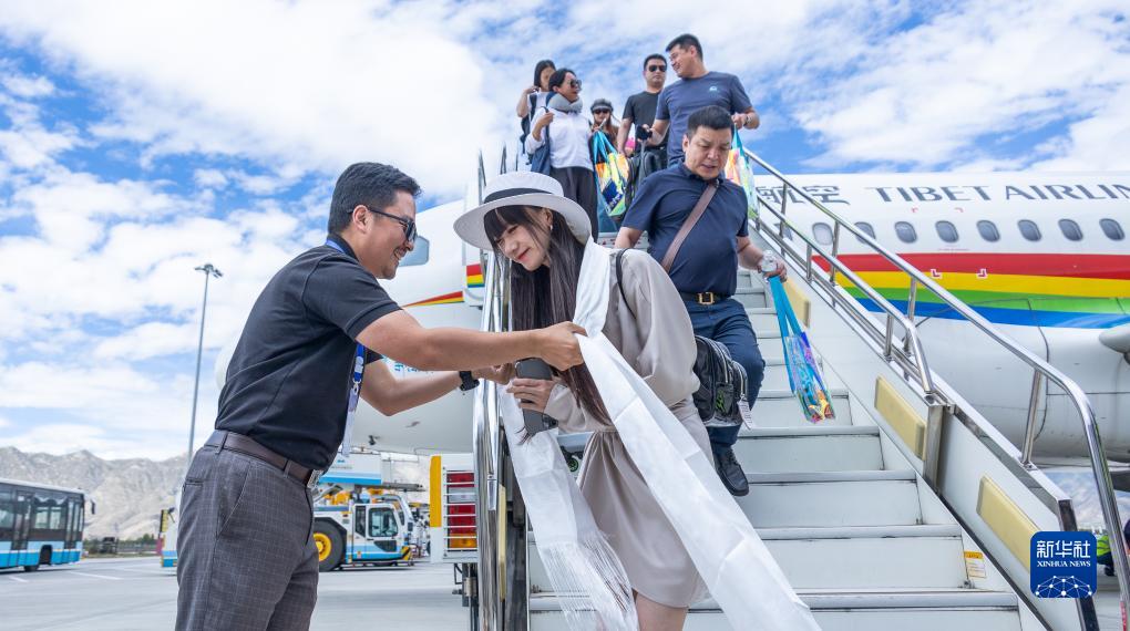 在西藏航空“地球第三極號”飛機首航儀式現場,工作人員為游客獻上哈達(8月25日攝)。新華社發(丁增尼達攝)
