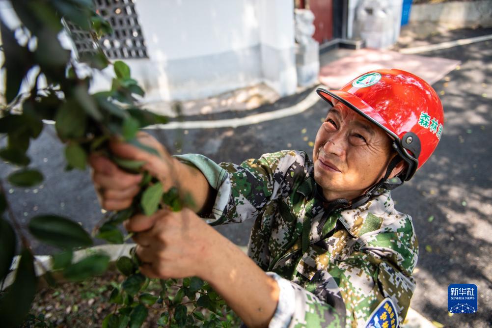 8月24日,在瀏陽市金剛鎮丹桂村,黃蔚谷處理纏繞在古樹上的藤蔓。