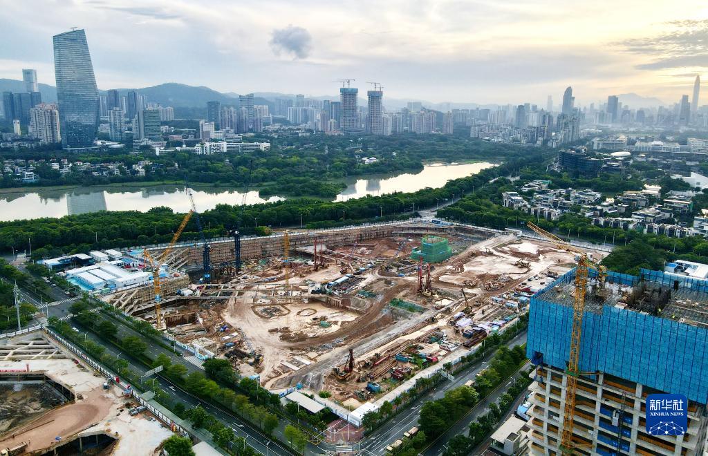 這是由中建五局承建的深圳灣濱海商務中心項目,現場150余名建設者在進行地下室基坑和視覺樣板地上主體結構作業(8月26日攝)。