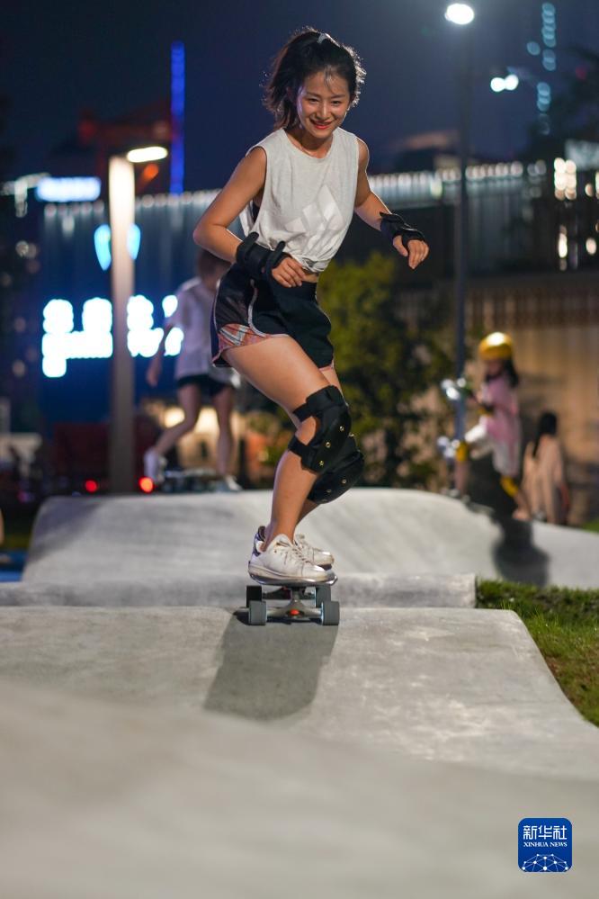 市民在南京市建鄴區西城·夜未央運動街區滑滑板(8月25日攝)。