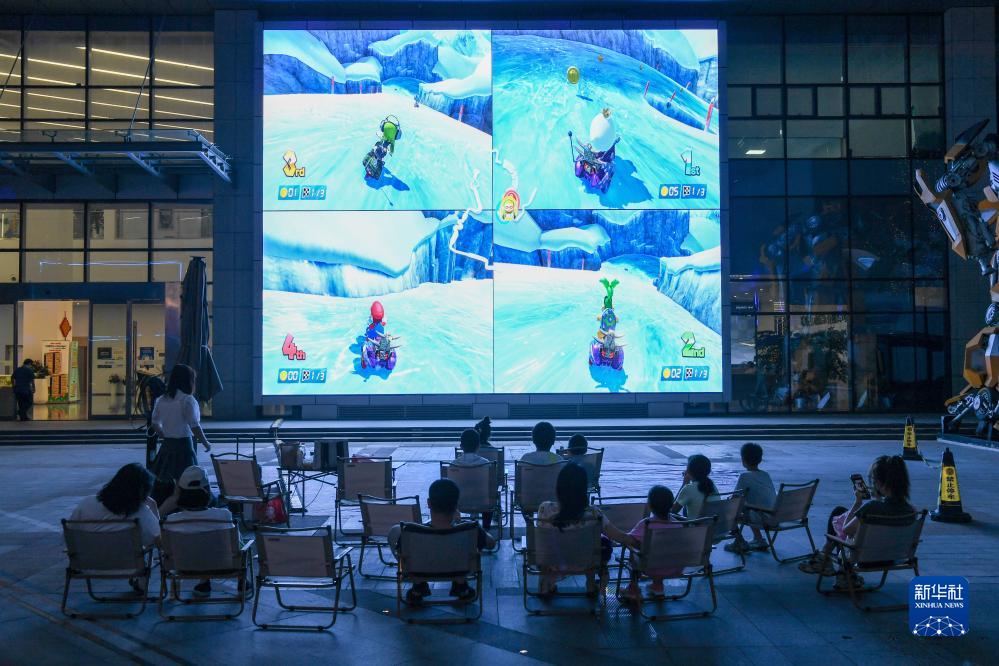 市民游客在南京市建鄴區西城·夜未央街區進行電子游戲對戰(8月25日攝)。