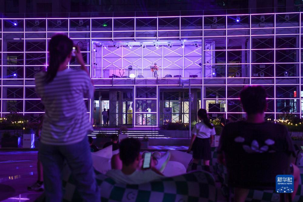市民游客在南京市建鄴區西城·夜未央街區內觀看空中舞臺表演(8月25日攝)。