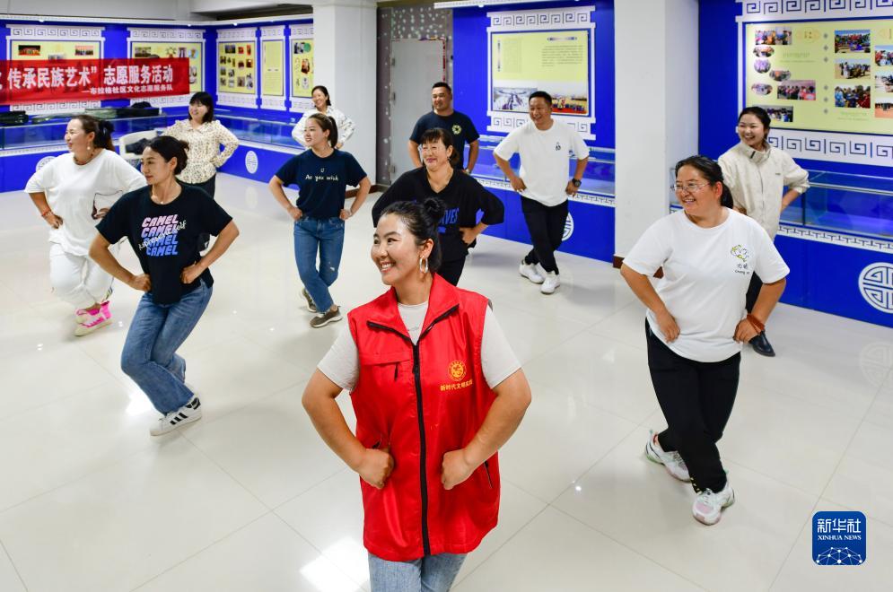 8月26日,在鄂托克前旗上海廟鎮阿勒臺嘎查文化活動中心美育課堂上,志愿者奇明(前)帶領農牧民練習舞蹈。