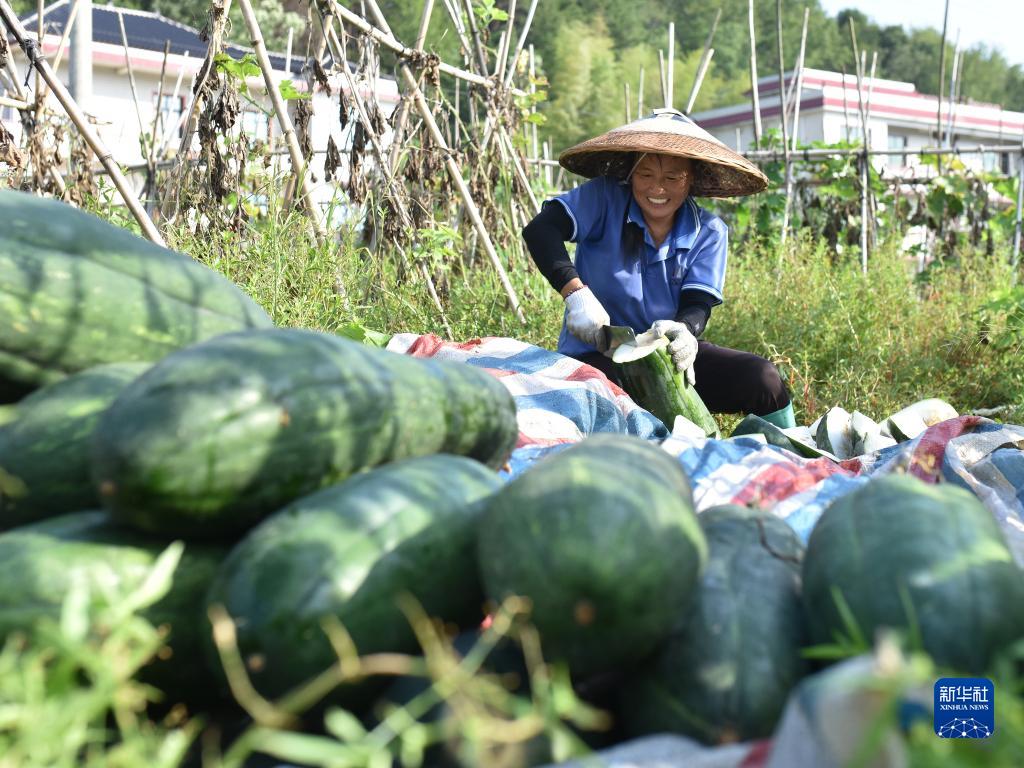8月26日,在湖南省婁底市雙峰縣花門鎮扶槎村,農民在田間提取制種冬瓜籽。