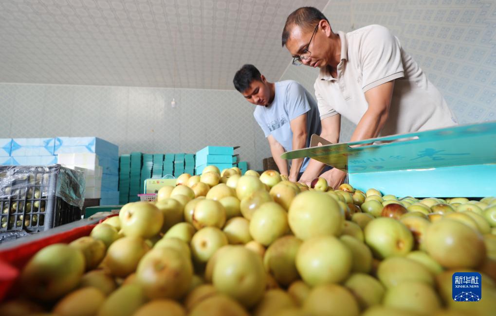 8月26日,在湖南省衡陽市衡山縣永和鄉冬棗種植基地,當地村民在分揀包裝冬棗。