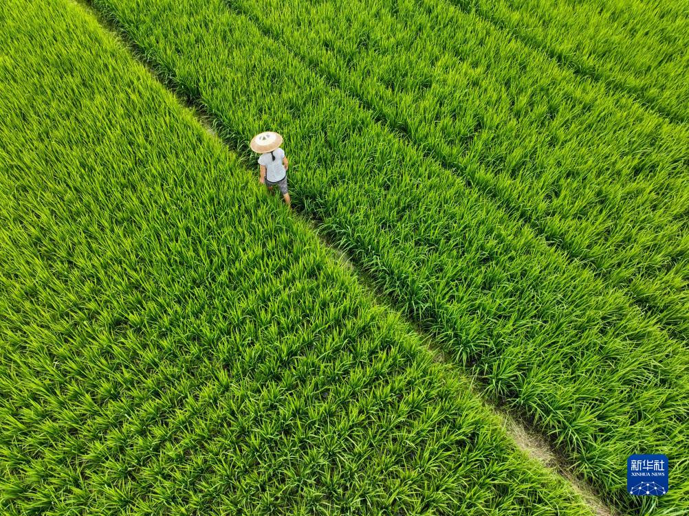 8月26日,在湖南省永州市道縣萬家莊街道五洲社區,農民在查看晚稻長勢(無人機照片)。
