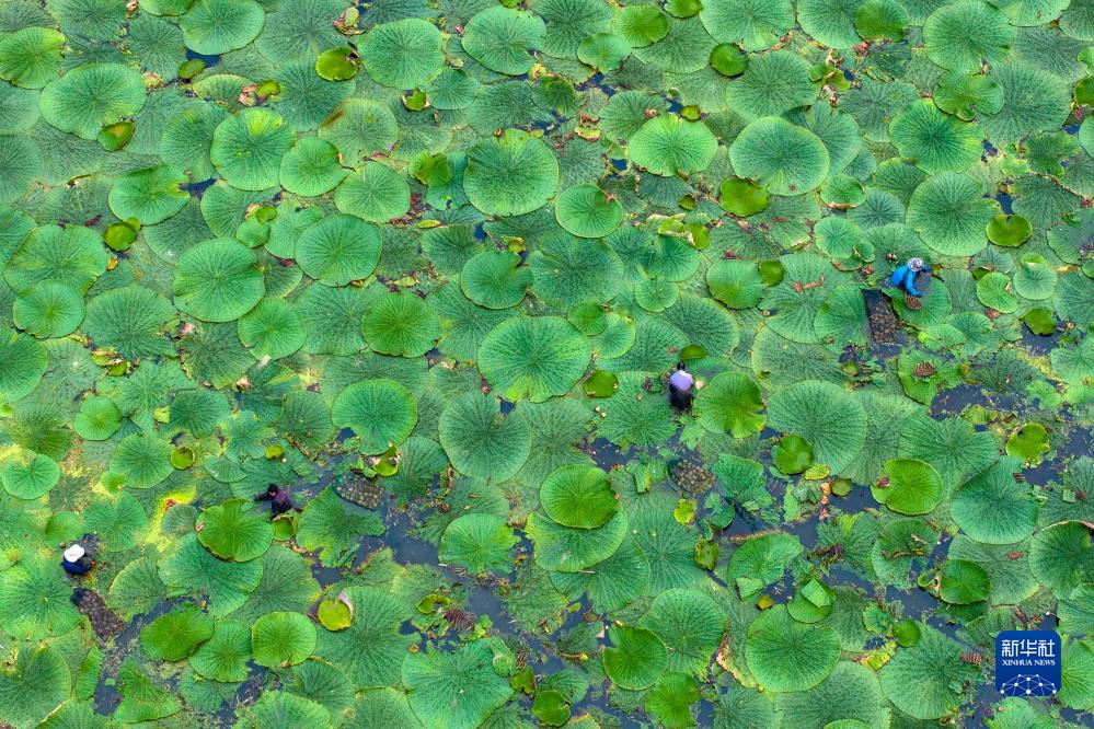 8月26日,江蘇省泰州市姜堰區顧高鎮申俞村農民在采收芡實(無人機照片)。