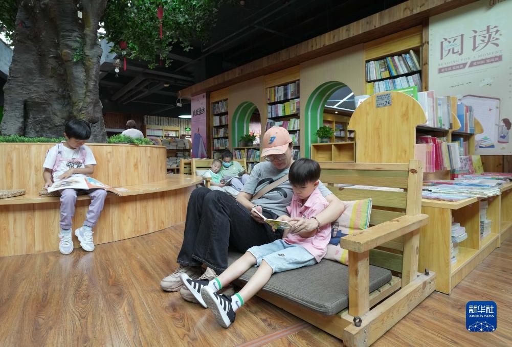 8月26日,家長帶著孩子在秦皇島市海港區青年書店閱讀區閱讀。