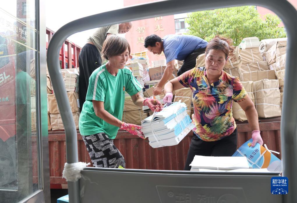 8月26日,在山東省臨沂市臨沂沂河實驗學校,學校教職工在搬運新學期教材。