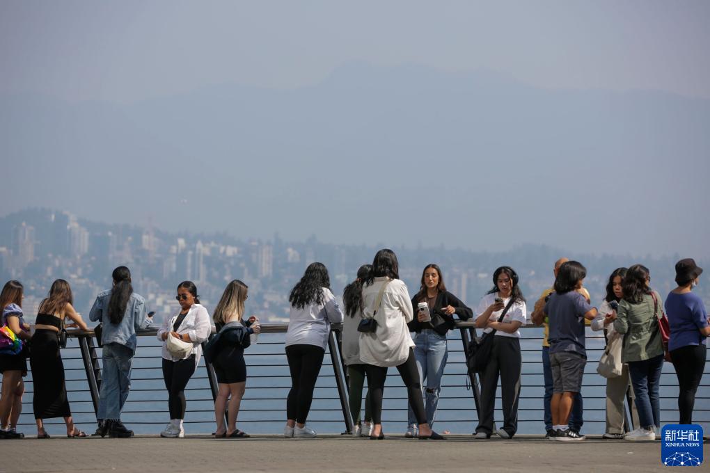 8月26日,在加拿大溫哥華,人們在煙霧籠罩的海濱休閑。