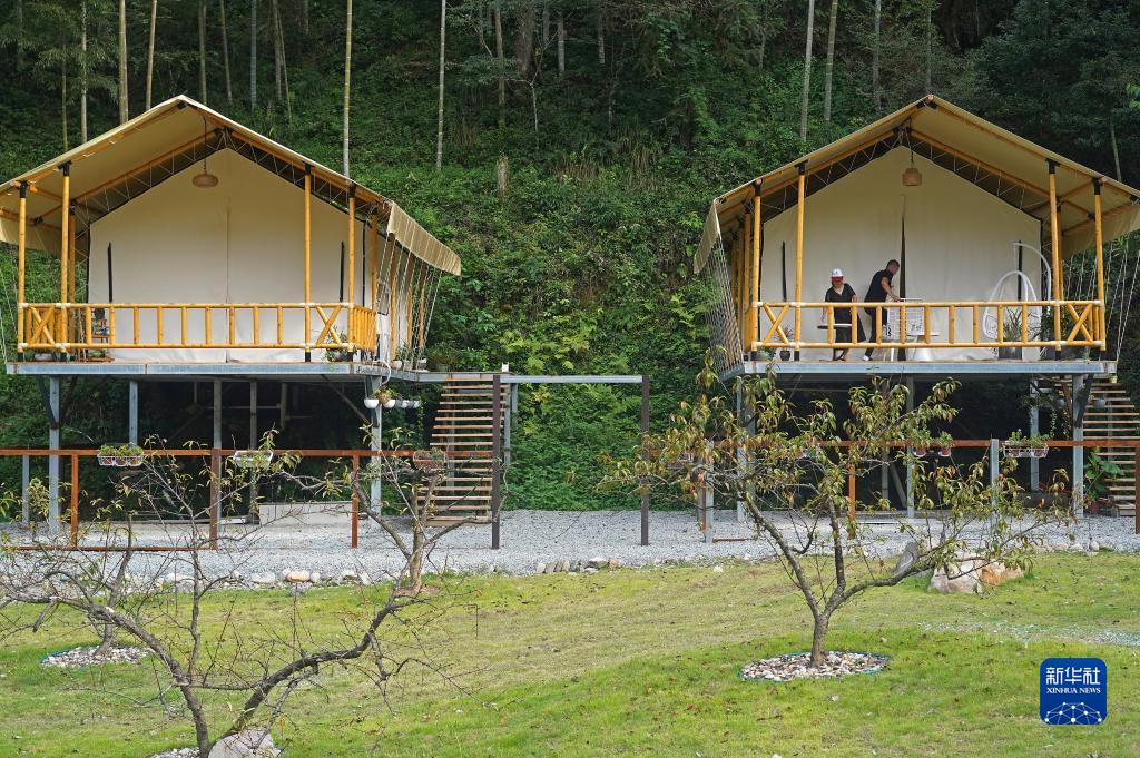 村民在打掃戶外帳篷,港背村瑪瑙巖森林小鎮的戶外帳篷營地不久后將對外開放(8月24日攝)。