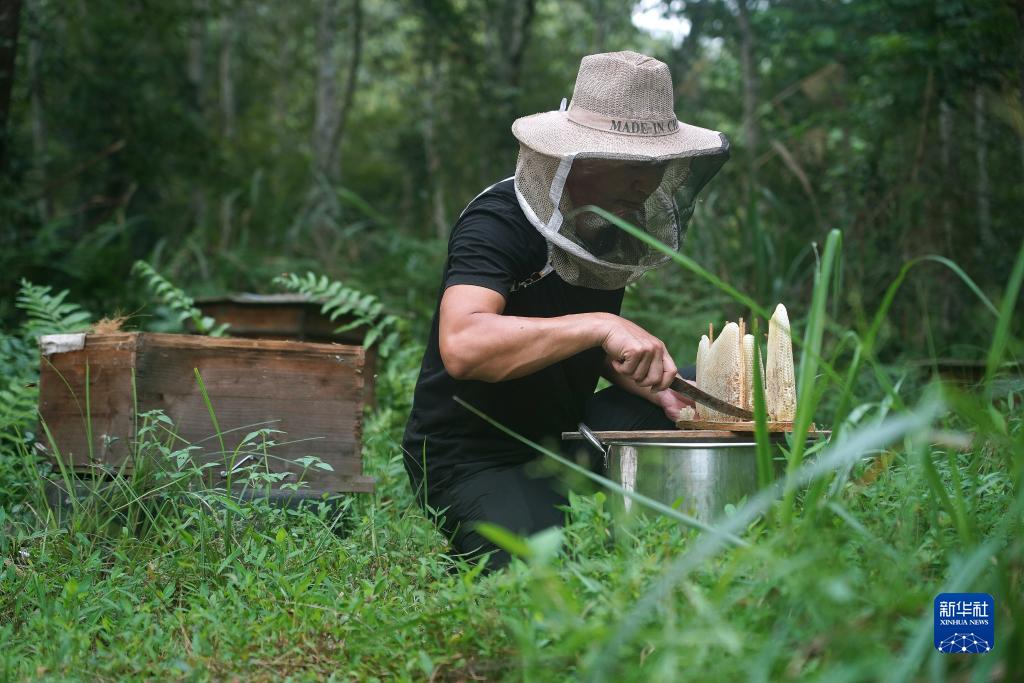 村民劉煌平在收獲蜂蜜(8月24日攝)。