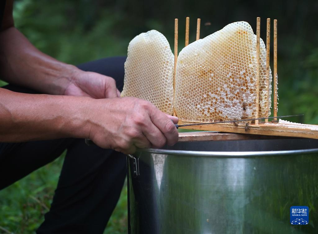 村民劉煌平用刀割蜜(8月24日攝)。
