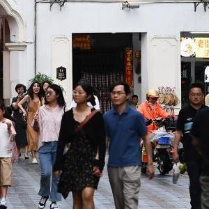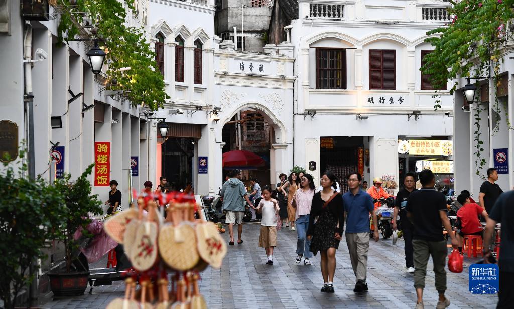 游客在??隍T樓老街參觀游玩(8月21日攝)。