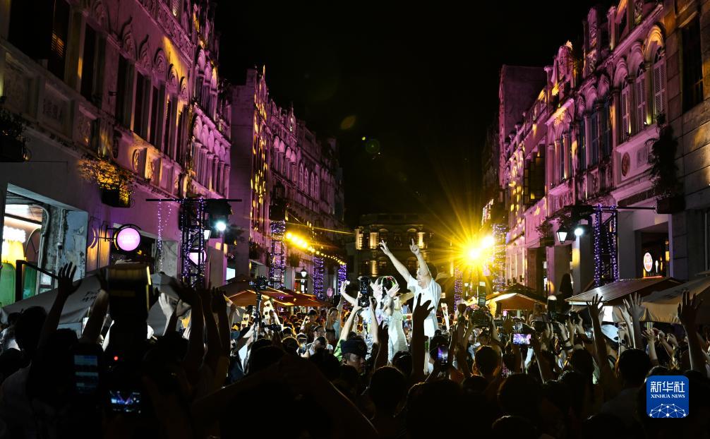 游客在??隍T樓老街觀看演出(8月22日攝)。
