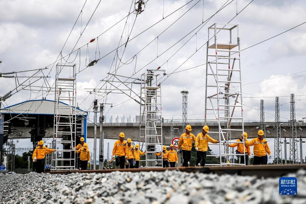 8月27日,中國鐵路南寧局集團有限公司南寧供電段的接觸網工在南寧第二動車所存車線內步行前往作業地點。