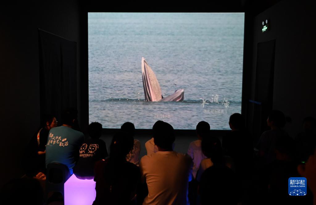 8月26日,游客在國家海洋博物館“鯨奇物語”展區觀看鯨魚相關科普視頻。