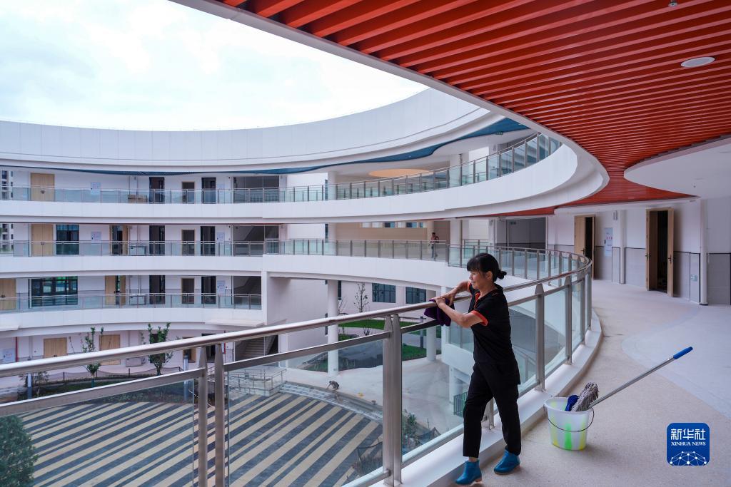 8月27日,在重慶市北碚區兩江春暉小學,工作人員在清潔教學樓護欄。