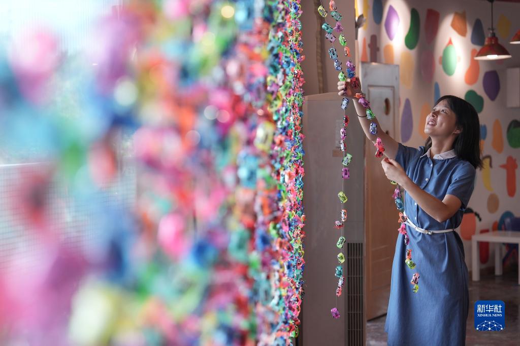 8月27日,在重慶市北碚區縉云幼兒園美術室,教師在整理玩具掛件。